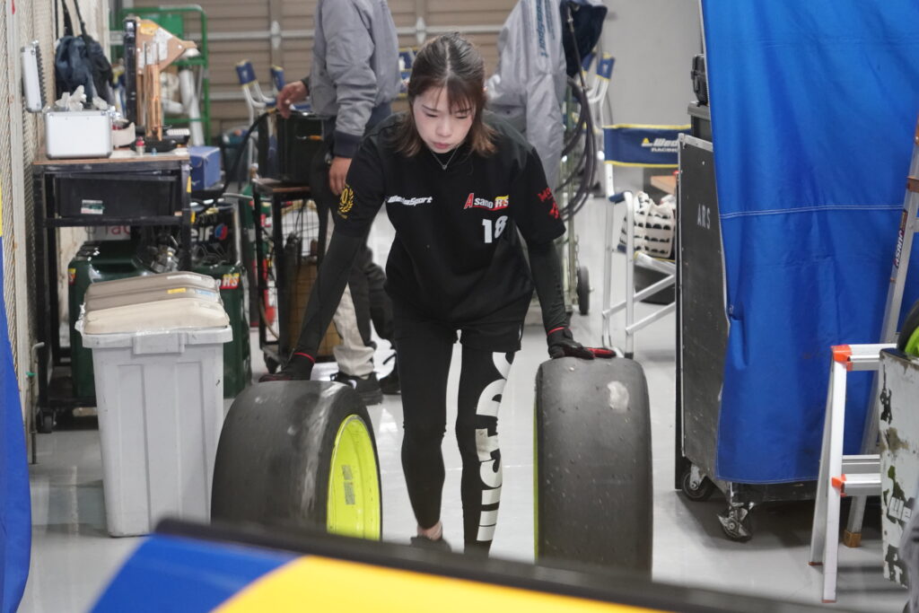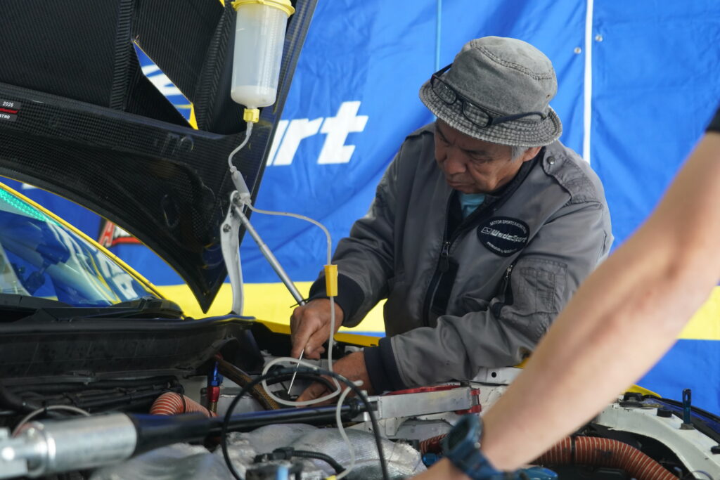 その後、武夫さんがステアリングを握り、箕輪くん、藤原くんとつないでいき、最後に4周を計測。2分24秒台では周回できたものの、予選ではなんとか23秒台に入れたいと監督から激励を受けました。事前テストでは出ていた23秒台が出せず、路面や外気温の変化にうまく適応できていない自分に、正直ショックを受けました。